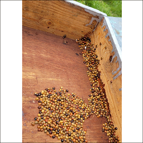 Une photo de colonie de coccinelles sous le toit d’une ruche pour passer l’hiver au chaud.